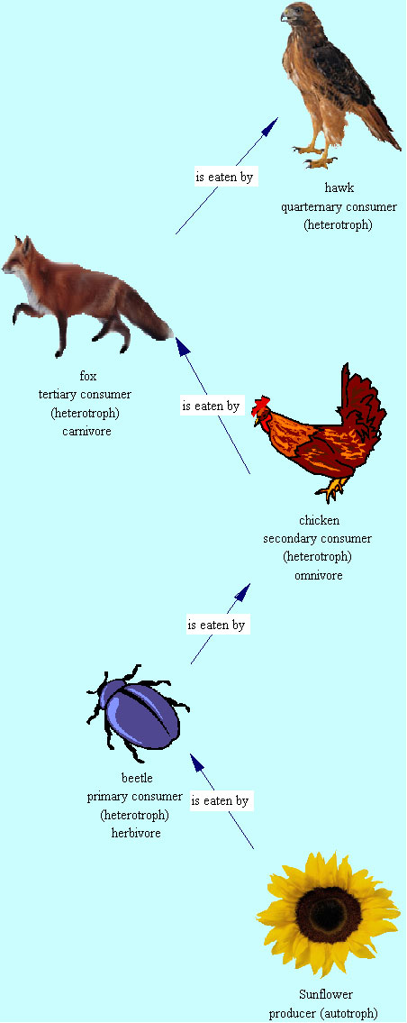Food Chains follow the flow of energy from one organism to another. It is a sequence of organisms, with each organism feeding on the one below it in the food chain. Predators often top the food chain. Food chains can be simple with just two trophic levels (producer -> herbivore), or more complex with many tropic levels (producer -> herbivore/omnivore -> carnivore -> secondary carnivore).